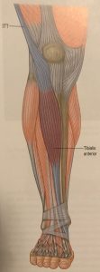 Az elülső oldalon a felszínes, tapintható nagy izom az elülső sípcsonti izom a lábháti hajlítást végzi elsősorban, alapvetően antagonista izma a háromfejű lábikra izomnak, ina a talpon tapad, és a lábszár külső oldalán futó szárkapcsi izomok inával szoros együttműködésben nagy jelentősége van a hosszanti lábboltozatok dinamikus fenntartásában.